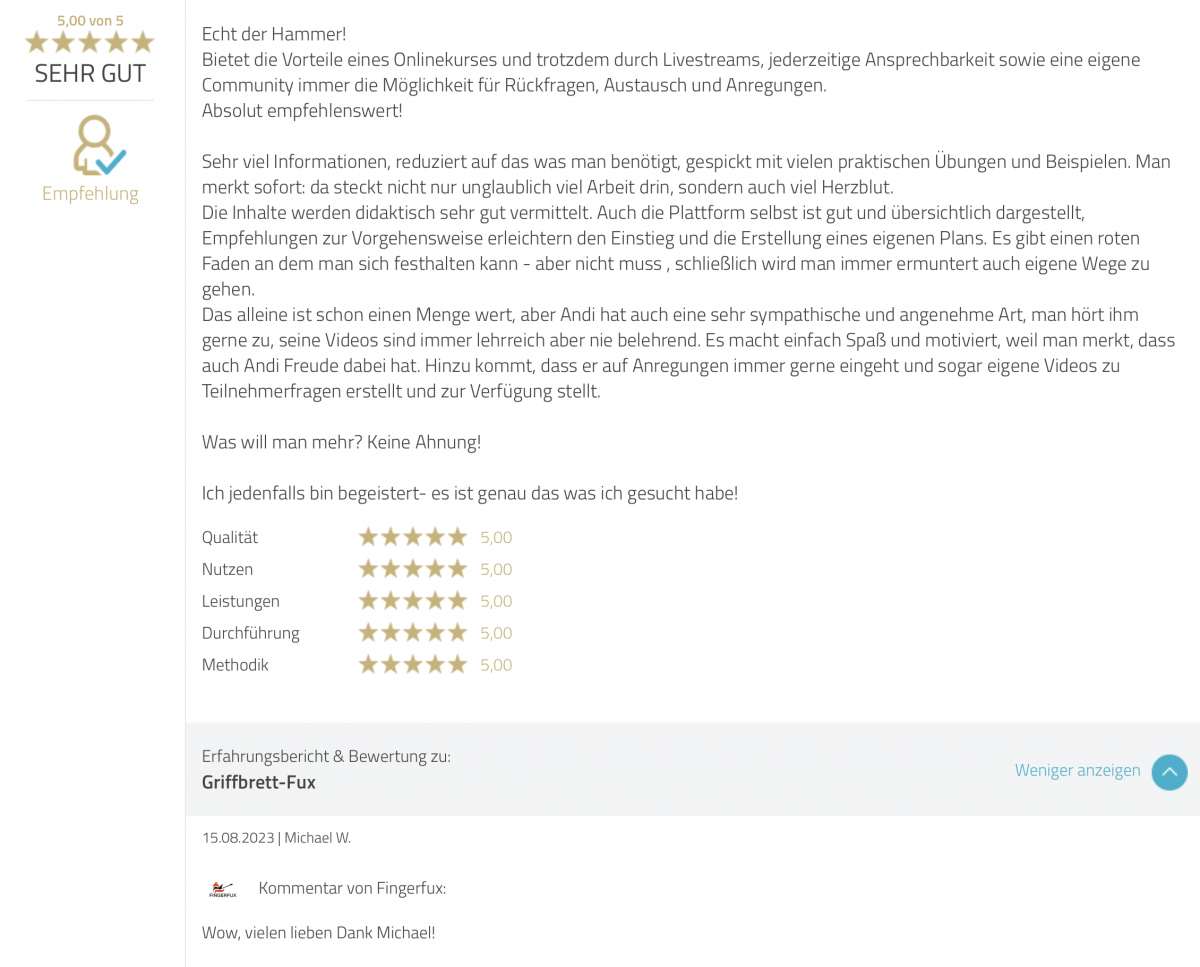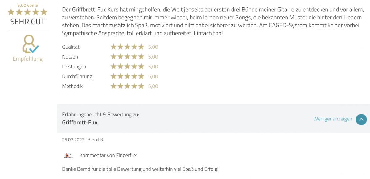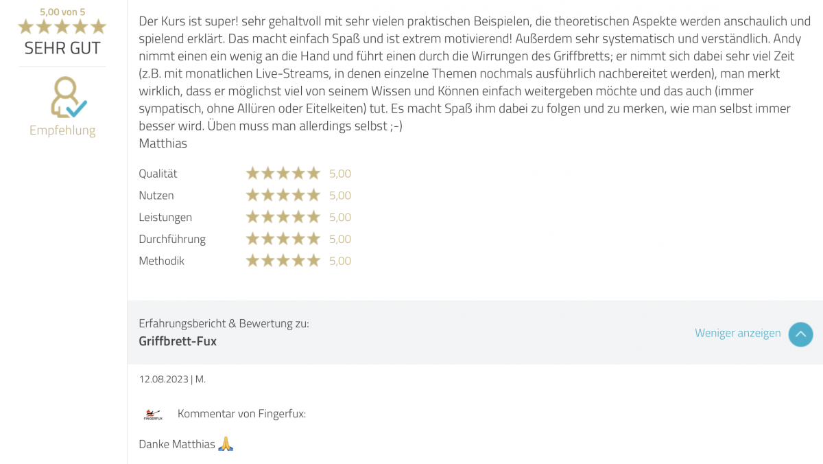Meine weiteren Kurse, die nicht in der Verkaufsbeschreibung gelistet sind (Rhythm&Groove, Travis Picking etc...) sind KEIN Bestandteil des Griffbrett-Fux. Hierbei handelt es sich um eigenständige Kurse.
