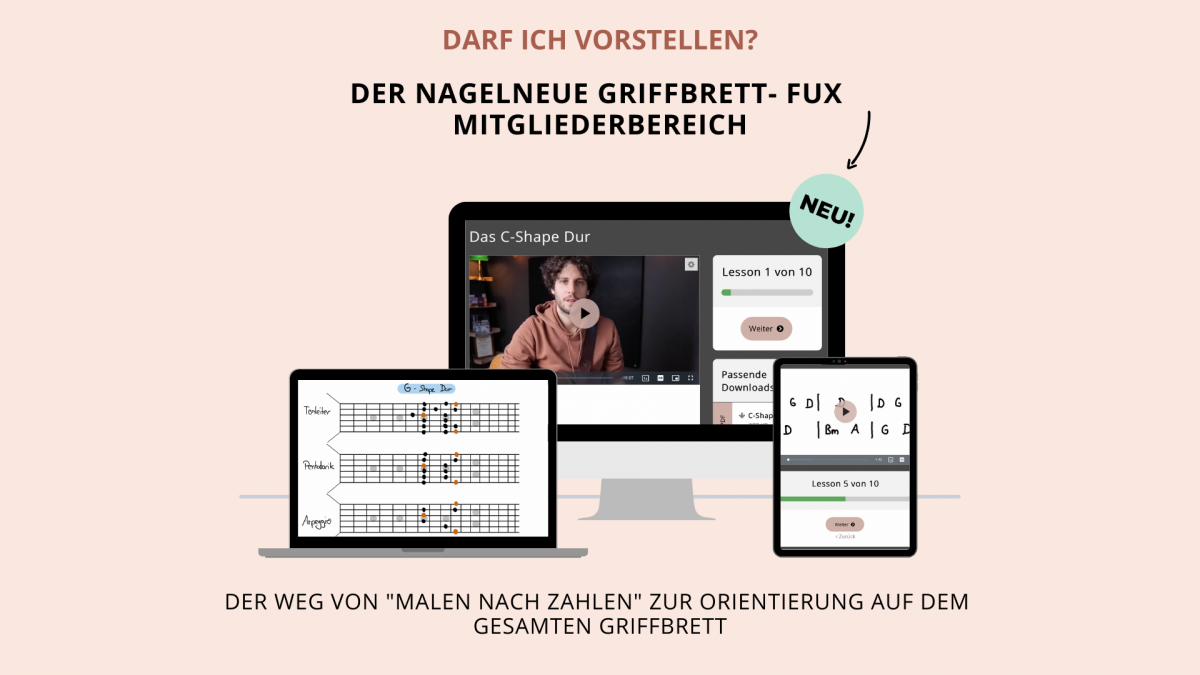 Anhand der einfachen Akkorde, die du schon kennst, wirst du lernen, jeden Akkord überall auf dem Griffbrett zu spielen. Diese Akkorde wirst du in allen Positionen mit der passenden Tonleiter umspielen können.